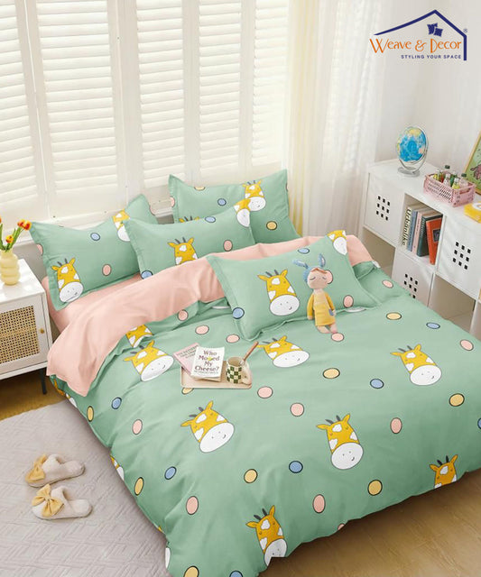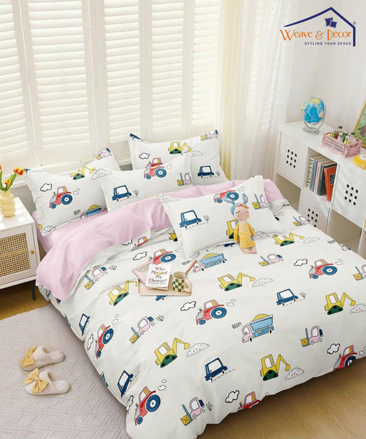 At Weave & Decor, we understand that a kids bedroom is not only a bed space but their own world, their own universe. where they are busy with their favourite cartoon character design, read their bedtime stories, and dream big dreams. That's why we offer you a cute single bedsheet range that is carefully designed to bring happiness, colour, and comfort into your child's life. From bold, creative designs to soft fabrics that are gentle on sensitive skin, every aspect is carefully considered. These bed sheets are not only pretty, they contribute to a supportive, content, and able to be themselves. Whether you’re giving their room a fresh new look, or looking for the perfect gift. Our kids single bedsheets come with Single bed sheet with cushion cover.