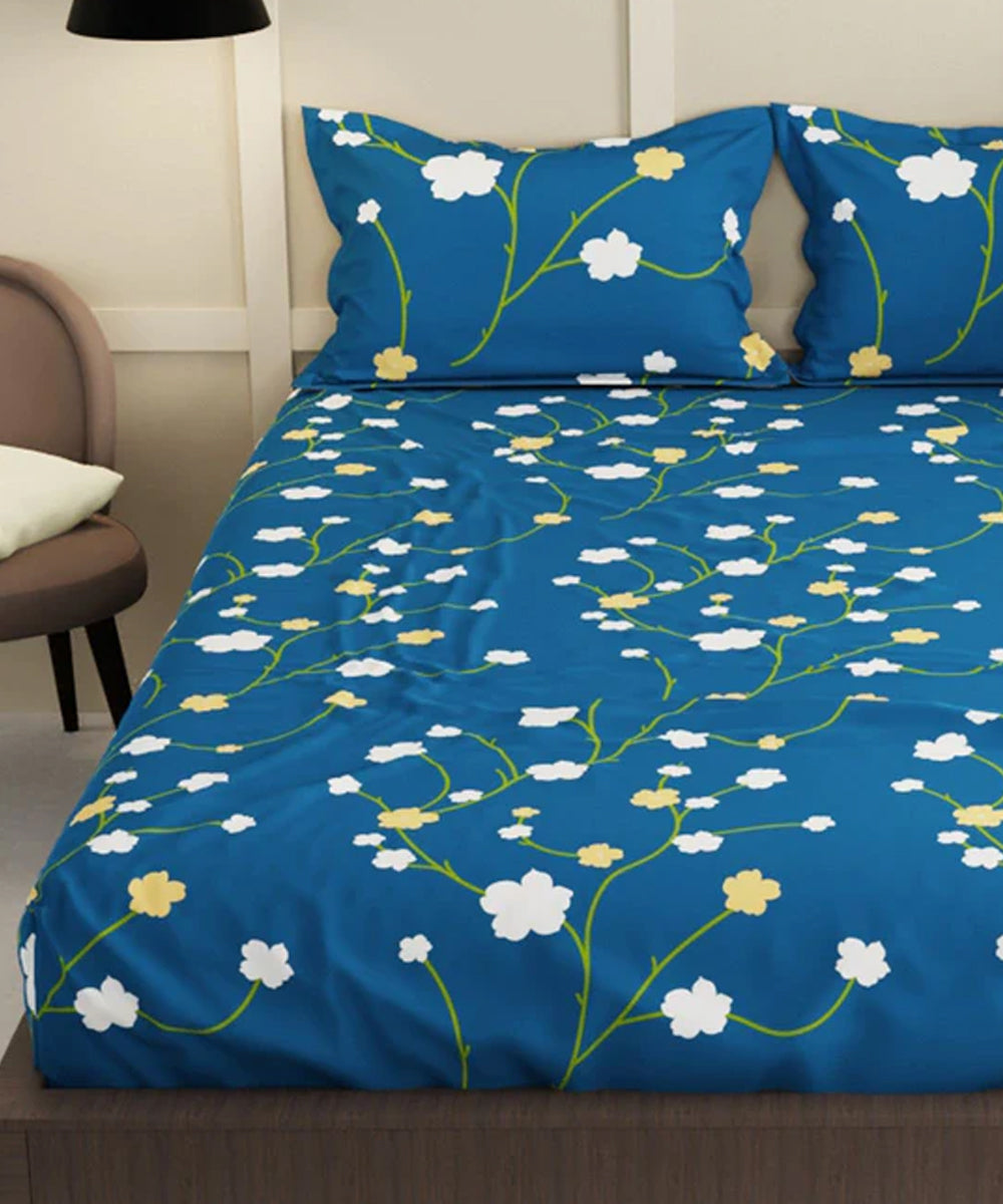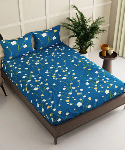 Blue Floral King Fitted Bedsheet With 2 Pillow Covers