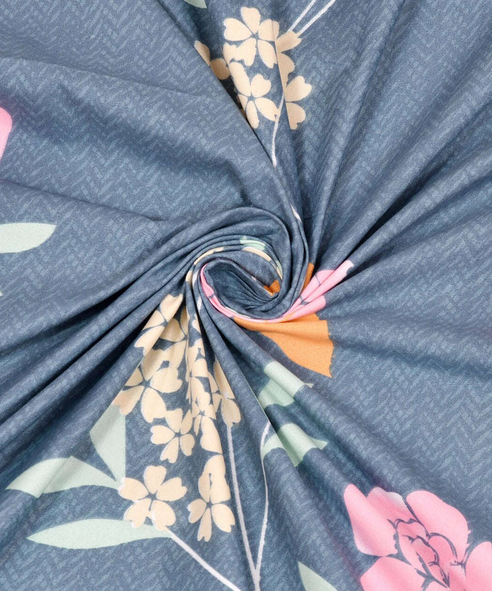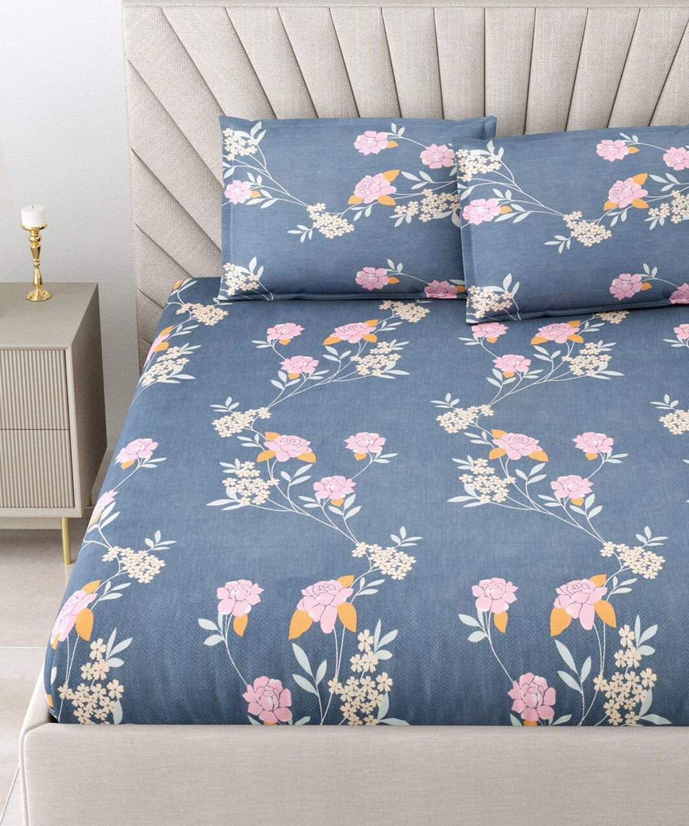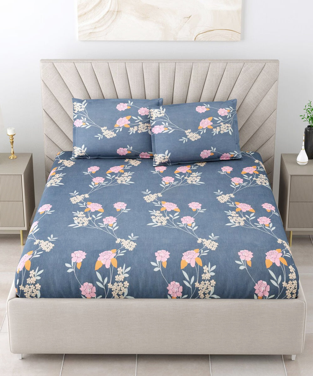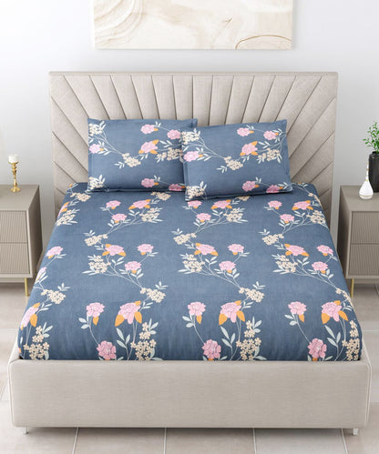 Blue Floral Queen Fitted Bedsheet With 2 Pillow Covers
