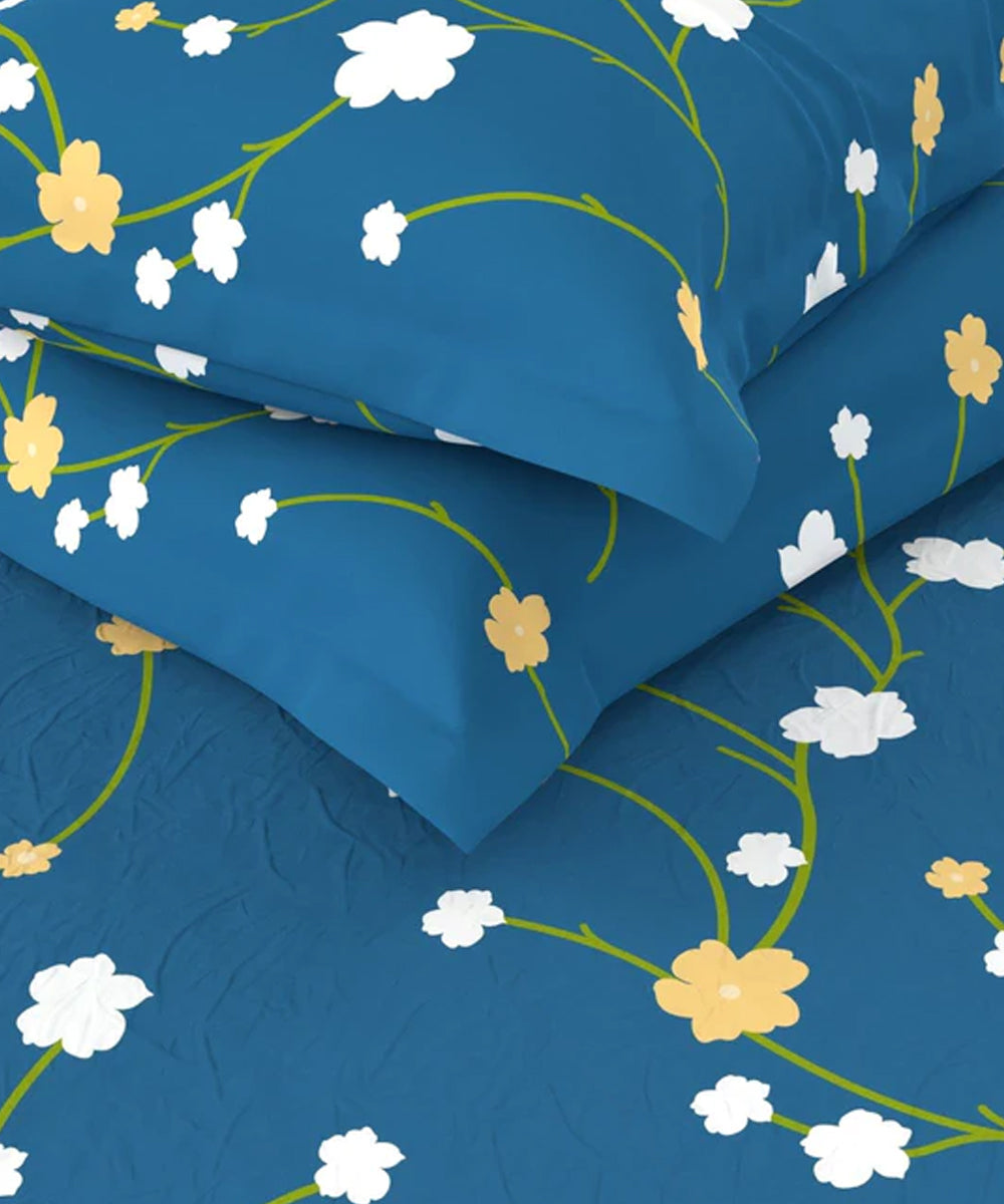 Blue Floral Queen Fitted Bedsheet With 2 Pillow Covers