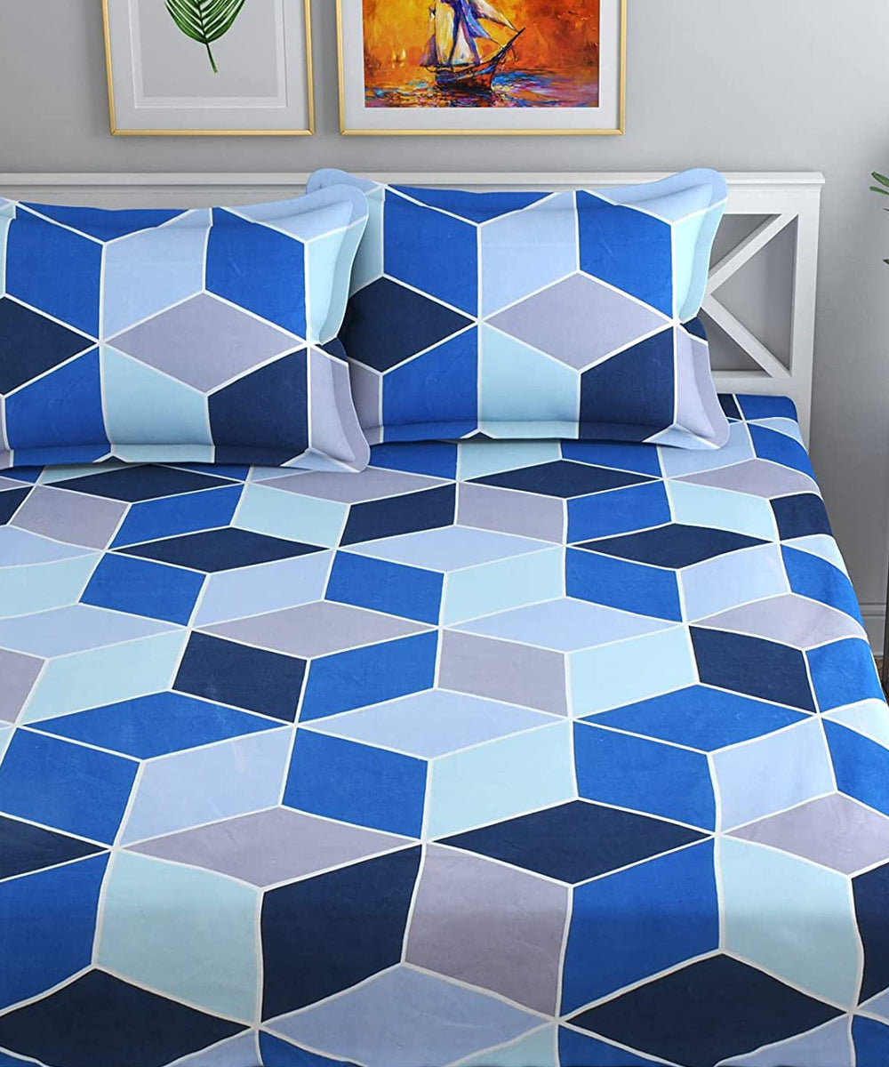 Blue Geometric Super King Fitted Bedsheet With 2 Pillow Covers