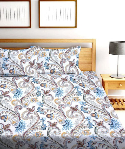 Weave & Decor reimagines floral finesse with Cream Blossom, a bedsheet that captures movement and elegance in every curve. Set against a soft off-white backdrop, the swirling patterns in blue, mustard, and deep maroon bring vibrant energy without overwhelming the space. A graceful balance of tradition and artistry — made to refresh modern bedrooms.