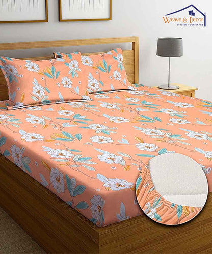 Peach Floral King Fitted Bedsheet With 2 Pillow Covers