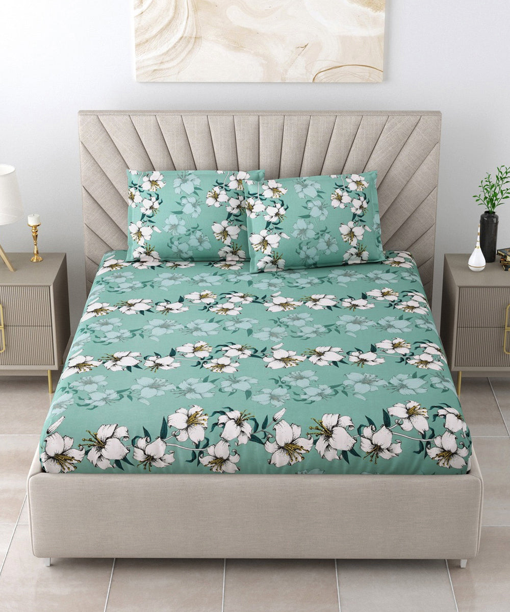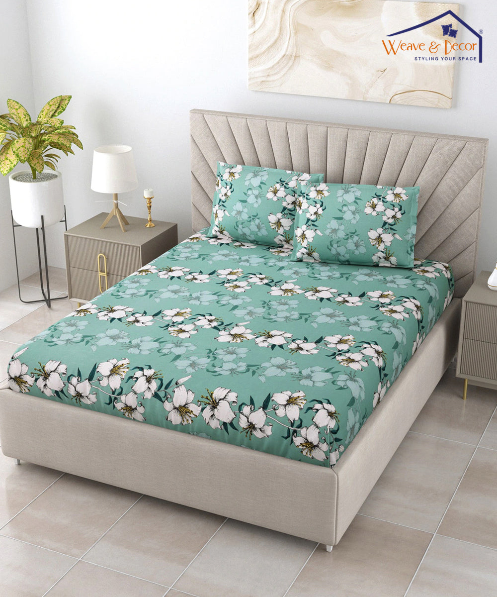 Green Floral Single Fitted Bedsheet With 1 Pillow Cover