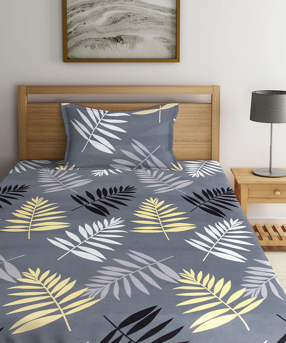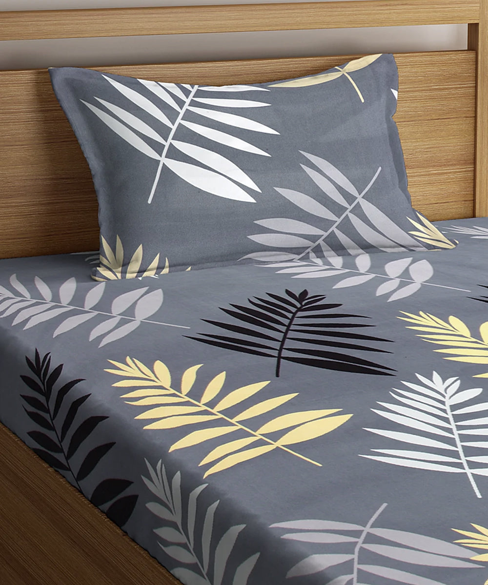 Grey Floral Single Fitted Bedsheet With 1 Pillow Cover