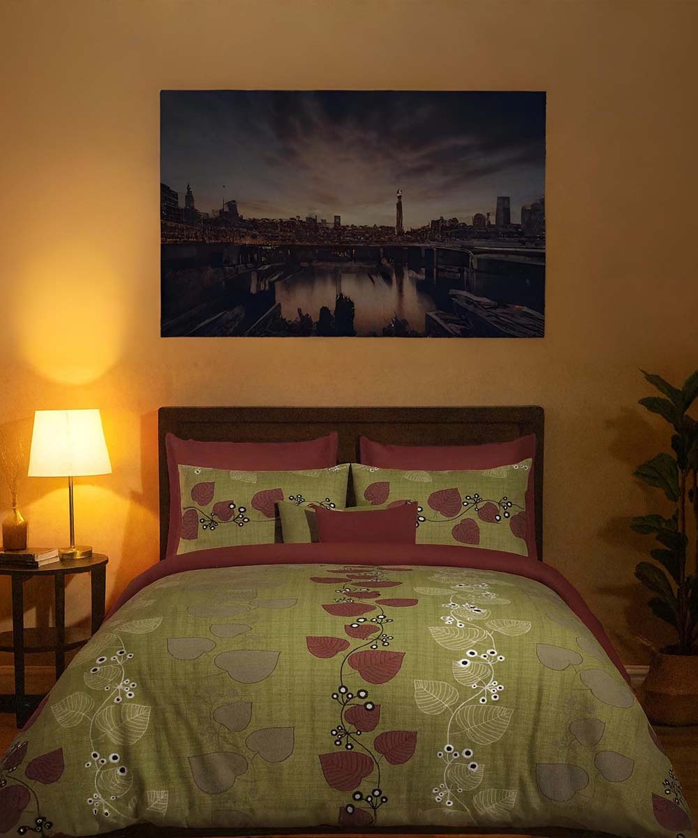 Leafy Charm – Red & Olive 200 GSM Pure Cotton Double Bedsheet With Pillow Covers |90x100 inches