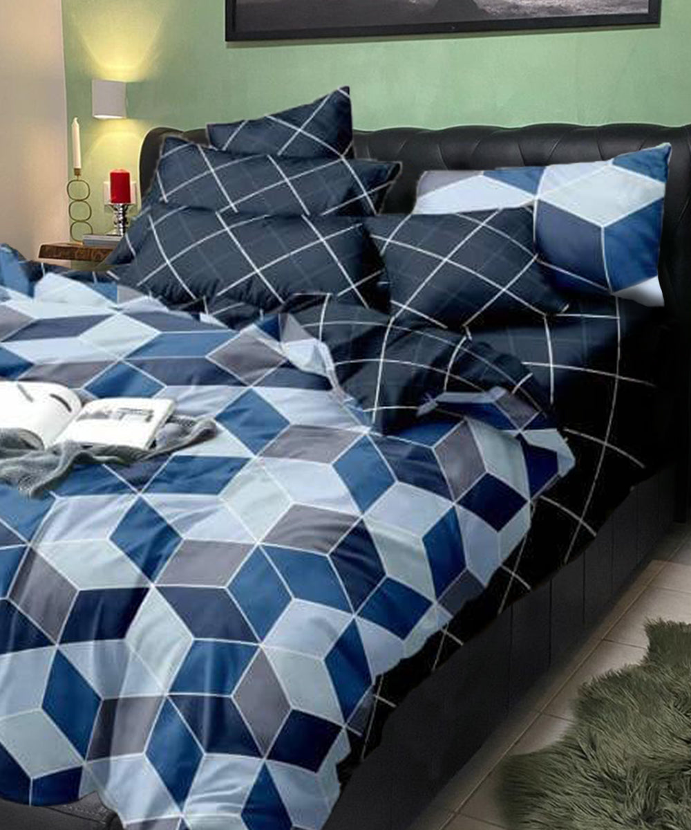 Modern Rhombus Blue Flat Double Bedsheet with 2 Pillow Covers