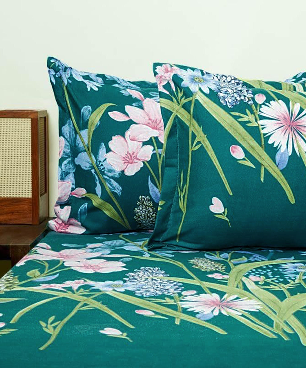Weave & Decor presents a lively ensemble with Evergreen Floral Charm, full of blossoming joy. Green acts as the perfect stage for blooms in pink and blue to flourish. It transforms ordinary bedding into a statement of blooming serenity and everyday comfort.