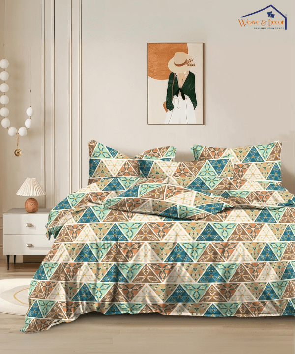 Bring home the warmth of the earth with Weave & Decor’s Tribal Mirage. Designed with bold geometric triangles in soothing tones of teal, brown, and beige, this set captures the essence of rustic elegance.