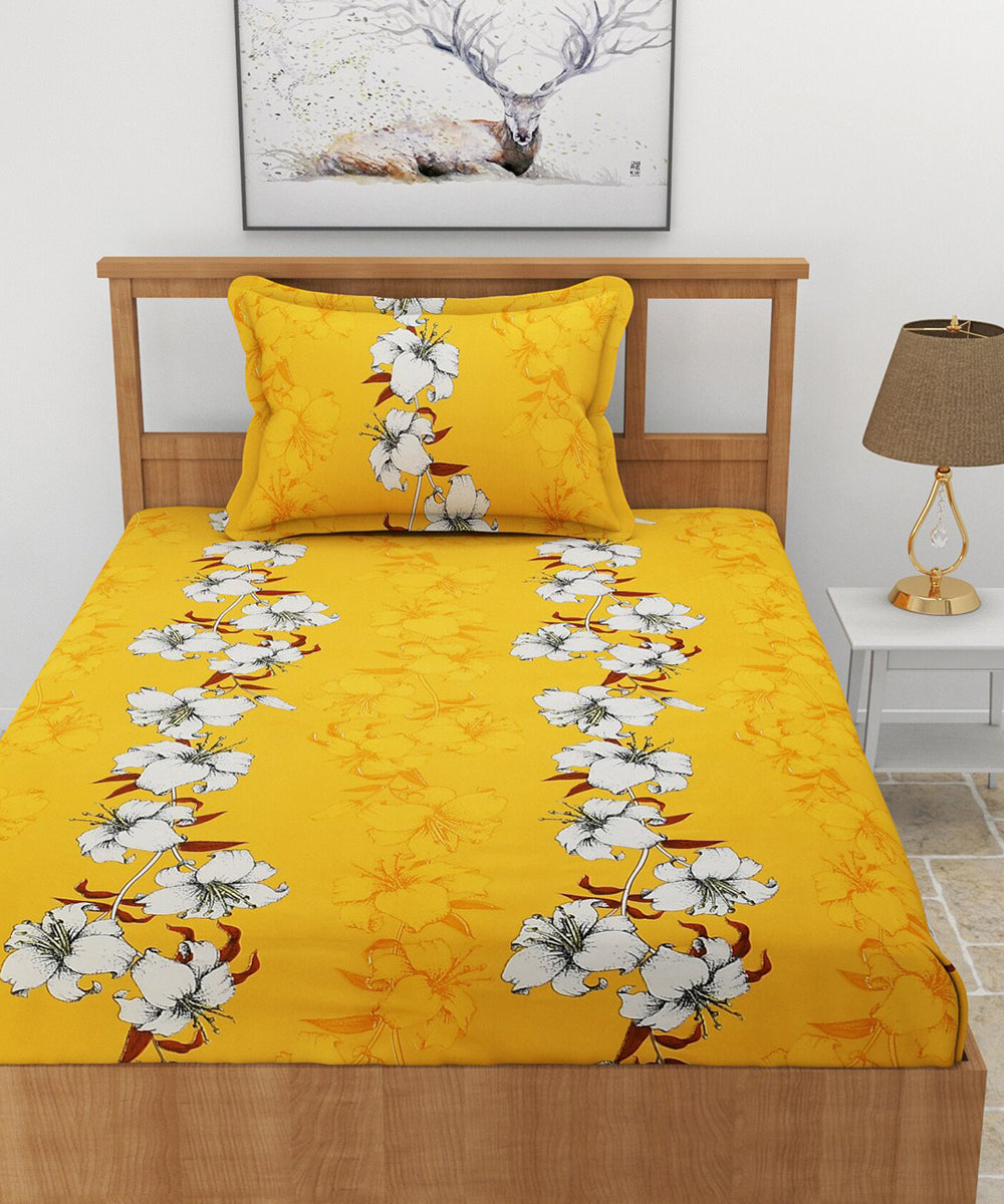 Mustard Floral Single Fitted Bedsheet With 1 Pillow Cover