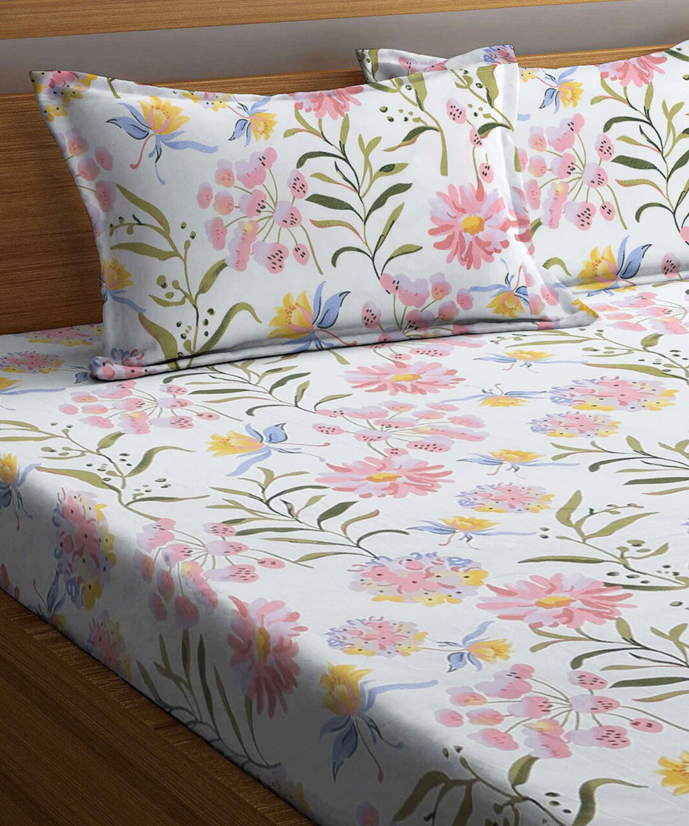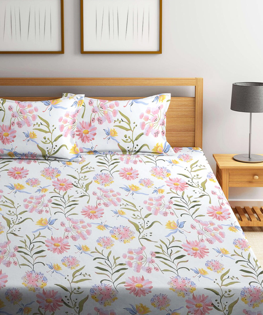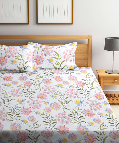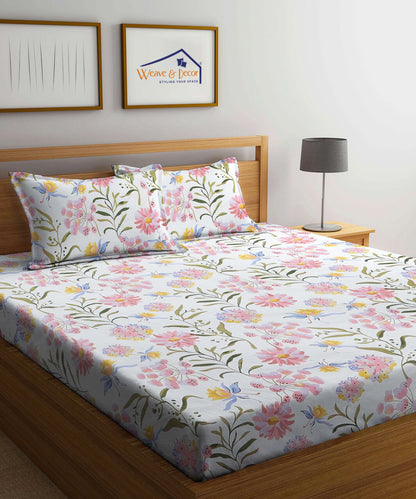 White Floral King Size Bedsheet With 2 Pillow Covers